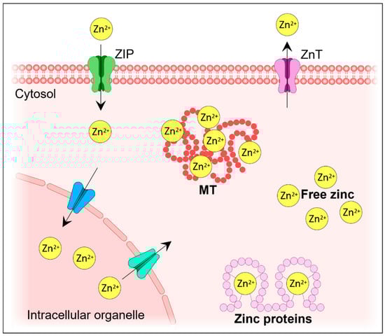 The distribution and expression of ZnTs are regulated by the bodyβs zinc status [27]. ZnTs that mediate the efflux of zinc into intracellular vesicles or out of the cell can decrease zinc availability within cells, whereas ZIP transporters that increase zinc uptake into cells and release zinc from intracellular vesicles can increase zinc availability (Figure 2) [28]. The expression and activity of these transporters are influenced by various factors, including cytokines (IL-1Ξ², IFN-Ξ³, and IL-6), hormones (insulin), zinc deficiency, and excess zinc [29]. With respect to zinc supplementation, the expression of ZnT1 in the intestinal villi has increased in animal studies [30,31]. It is currently understood that ZnT1 acts as a zinc exporter and regulates zinc homeostasis by facilitating the elimination or acquisition of zinc in response to excess or deficiency, respectively [31].