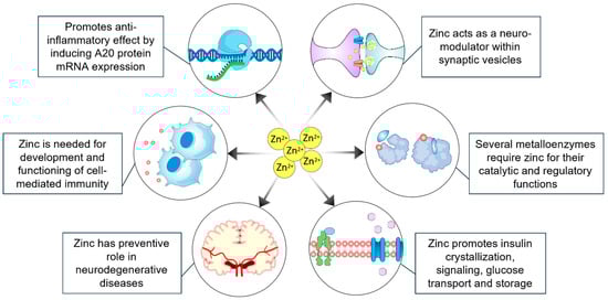Zinc is a crucial micronutrient that plays a vital role in the proper function of the immune system and the maintenance of overall health (Figure 3). It is essential for the proliferation and differentiation of immune cells [32] and potentially reduces viral infections [33,34]. Zinc has been found to bind nearly three thousand different proteins in the human body [35]. Many metalloenzymes require zinc for their regulatory and catalytic functions [35,36]. Zinc also serves as an important signaling molecule within the immune system and acts as a neuromodulator in synaptic vesicles. Several studies have indicated that zinc deficiency may contribute to the development of chronic and metabolic diseases, such as diabetes, neurodegenerative disorders, cancer, and intestinal diseases [6,37,38,39,40,41,42]. Adequate levels of zinc are essential for maintaining oral health [43] and for various hormonal functions [44]. Furthermore, zinc plays a role in lipid metabolism during obesity, often associated with type 2 diabetes. Studies have shown that zinc status can influence lipid profiles, the functionality of adipose tissue, adipokine production, and insulin sensitivity [45,46]. Earlier studies reported that zinc can exert insulin-like effects on adipocytes, influencing adipogenesis and glucose metabolism, and that zinc may play a role in enhancing insulin sensitivity in adipose tissues [47]. Zinc deficiency is a common clinical manifestation in individuals with obesity, perhaps thereby exacerbating metabolic dysregulation. Zinc supplementation has been shown to improve lipid profiles and potentially minimize some of the harmful consequences of obesity [48,49]. Obesity is frequently associated with lower serum levels of zinc in both genders than in their lean counterparts. Noteworthy, although childhood obesity is more common in boys than in girls, obesity becomes more common in adult women than in their male counterparts [50].
