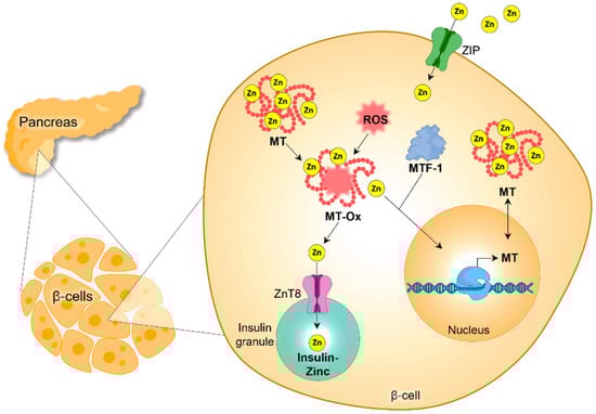 Zinc homeostasis and pancreatic Ξ²-cell: intracellular free cytosolic zinc can be imported via ZIP transporters or released from metallothionein (MT) during cellular stress. It enters insulin granules through ZnT8 to form crystalline insulin-zinc hexamers. Zinc also binds to metal-responsive transcription factor-1 (MTF-1), which translocates to the nucleus to up-regulate gene expression of MT. MT-Ox, oxidized MT; ROS, reactive oxygen species [62,63].