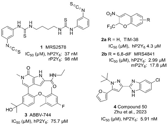 Selected P2Y6R antagonist structures, with the IC50 values in inhibition of UDP-induced Ca2+ mobilization in hP2Y6R-expressing 1321N1 astrocytoma cells (h, human; r, rat; m, mouse) [33].