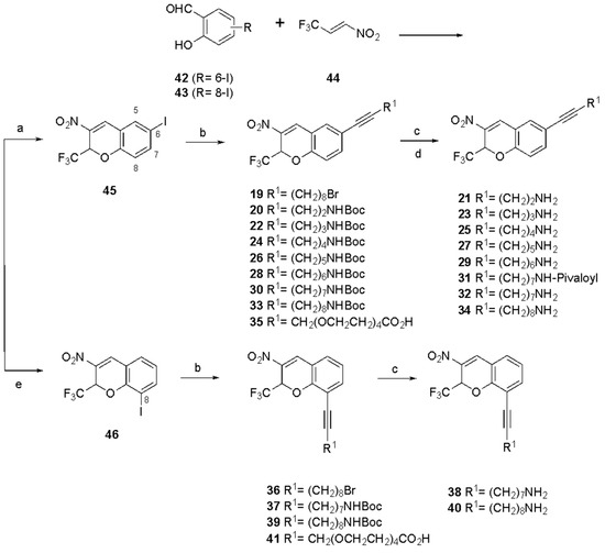 The list of 2H-chromene analogues compared here for human (h) P2Y6R functional inhibition is shown in Table 1, including reference compounds 2 and 4–18. The primary pharmacological assay consisted of the calcium mobilization measurement in hP2Y6R-expressing 1321N1 astrocytoma cells using a fixed UDP (agonist) concentration of 100 nM [30,31]. The newly prepared derivatives (19–41) were synthesized as shown in Figure 2, with the full synthetic procedures and spectral characterization in the Supplementary Materials. The derivatization concentrated on the 6 and 8 positions of original hit compound 2a using 6-I and 8-I intermediates (10 and 11, respectively) subjected to Sonogashira reactions to install various extended alkyne chains, including those bearing a Boc-amino terminal group. The Boc protection was removed using TFA to yield the corresponding alkyl amines.