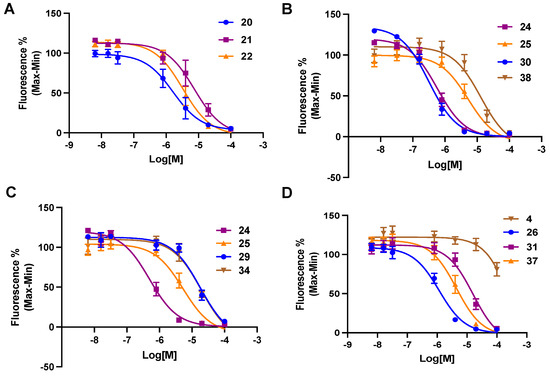 Table 1 shows the structures and P2Y6R inhibitory affinity of newly synthesized (19–41) compounds, as well as their lipophilicity and aqueous solubility predictions. Sigmoidal inhibition curves for selected derivatives appear in Figure 3. There is no indication of P2Y6R agonist activity for any tested antagonists. The high affinity reported for compound 4, in the reduction of IP3 production in response to 10 µM UDP in hP2Y6R-HEK cells [33], was not confirmed in our assay (Ca2+ mobilization in response to 100 nM UDP in hP2Y6R-1321N1 cells). Compound 4 appeared to be only a weak hP2Y6R antagonist (18.9 ± 8.5% inhibition at 100 µM).