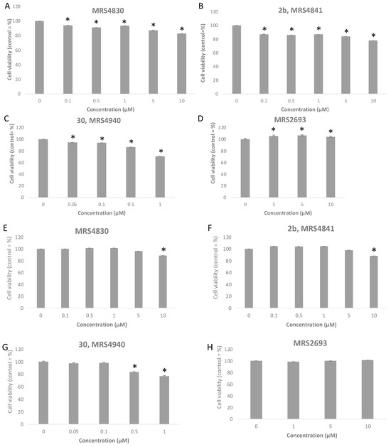 Cell viability of two cell lines (HeLa, (A–D); P2Y6R-astrocytoma, (E–H)) treated with antagonists MRS4830 (6-fluoro-3-nitro-2-(trifluoromethyl)-2H-chromene), 2b, and 30 and with agonist MRS2693 at a range of concentrations up to 10 µM, following exposure for 12 h. Viability was determined using the MTT assay [44], showing mean ± SEM as a percentage of control. * p < 0.05. Percent data are in Supplementary Materials.
