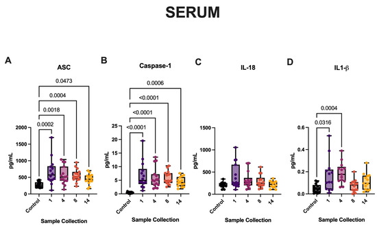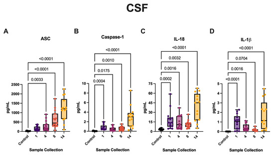 Analyses of the inflammasome protein concentration in serum and CSF samples were performed using a microfluidic immunoassay, the Ella System (ProteinSimple, San Jose, CA, USA), as described in [37,41]. The Ella System was used to quantify inflammasome protein (ASC, caspase-1, and IL-18) concentrations from the serum and CSF of patients described above.