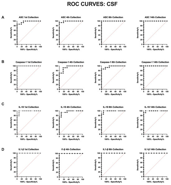 To determine whether inflammasome proteins are reliable biomarkers of aSAH in CSF and serum, we plotted the receiver operating characteristic (ROC) curve for each protein and determined the area under the curve (AUC) for each timepoint (Table 2). Accordingly, in the CSF, IL-1β (Figure 3D) had the highest AUC values for all timepoints at 1.0 (Table 2) with a specificity and sensitivity of 100% (Table 3). Caspase-1 (Figure 3B) also had an AUC of 1.0 (Table 2) with a specificity and sensitivity of 100% (Table 3) for the 1st and 14th collection. ASC (Figure 3A) also presented an AUC of 1.0 (Table 2) for the 8th and 14th collection with a specificity and sensitivity of 100% (Table 3), whereas IL-18 presented a high AUC value (0.99) (Table 2) at the 14th collection with a sensitivity of 100% and specificity of 91.67% with a cut-off point of >4.65 pg/mL. Overall, the results indicate that all four inflammatory proteins are reliable CSF biomarkers of the inflammatory response following aSAH up to 5 days post-injury.