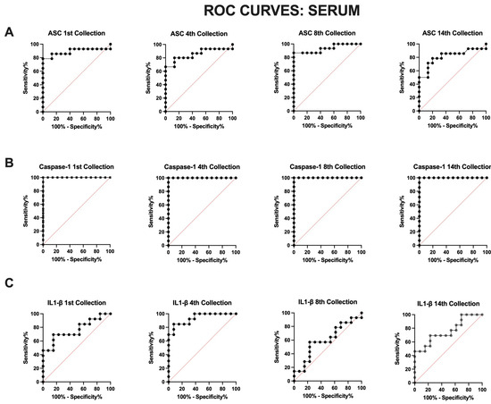 In serum, caspase-1 (Figure 4B) had the highest AUC value (1.0) (Table 4) for all timepoints with a sensitivity and specificity of 100% (Table 5). ASC (Figure 4A) also demonstrated a high AUC value of 0.93 (Table 4) with a sensitivity of 100% and specificity of 40% for the eighth collection with a cut-off point of 224 pg/mL (Table 5). IL-1β (Figure 4C) presented a high AUC value of 0.94 (Table 4) with a sensitivity of 100% and specificity of 61.54% for the fourth collection with a cut-off point of >0.06 (Table 5). These results demonstrate that caspase-1, ASC, and IL-1β are reliable serum biomarkers of the inflammatory response following aSAH up to 5 days post-injury.