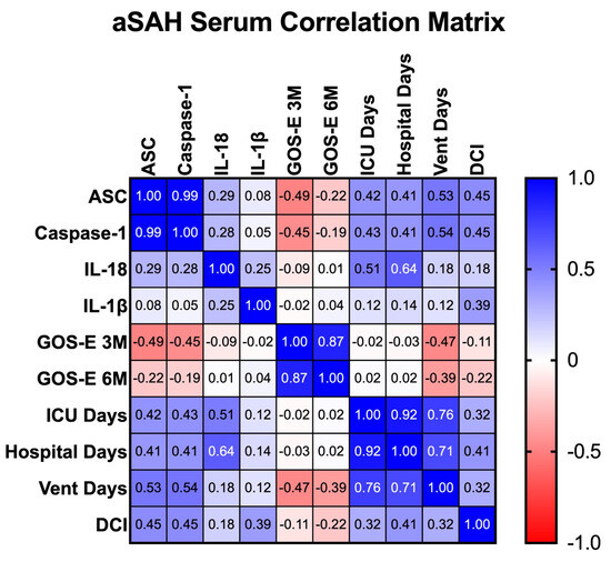 To determine the correlation across serum and CSF levels of ASC, caspase-1, IL-18, and IL-1β in aSAH patients, a Spearman r correlation matrix was performed (Figure 5). In the serum, the greatest positive correlation was found between ASC and caspase-1 with an r = 0.99 (p < 0.001).