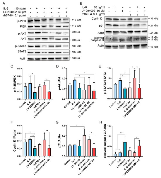 IL-6, an activator of PI3K/Akt/STAT3, partially attenuated B7-H4-induced inhibitory effects in SGHPL-5 cells. SGHPL-5 cells were incubated with rhB7-H4/IL-6/LY-294002 alone or in combination for 24 h, and the levels of PI3K/Akt/STAT3 pathway-related proteins, (A) as well as Cyclin D1, p21, and cleaved caspase 3 (B), were determined by immunoblotting. (C–E) Quantitative analysis of (A). (F–H) Quantitative analysis of (B). Data represent means ± SD of triplicate experiments. Significance: * p < 0.05, ** p < 0.01.