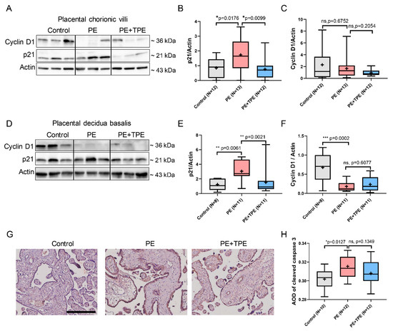 Immunoblotting results revealed that in placental chorionic villi (Figure 5A), the expression level of p21 of PE patients receiving standard of care was significantly higher compared to both the preterm control group (p = 0.0176) and the PE + TPE group (p = 0.0099) (Figure 5B). Conversely, Cyclin D1 did not reveal differences among the three groups (Figure 5C). Investigating decidua basalis tissue (Figure 5D), p21 displayed a similar trend: an increase in the PE group compared to the control group (p = 0.0061) and a decrease in the PE + TPE group compared to the PE group (p = 0.0021) (Figure 5E). The trend for Cyclin D1 was opposite to that of p21 (Figure 5C).