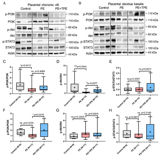 In chorionic villi, our findings revealed a significant decrease in the ratios of p-PI3K/PI3K and p-Akt/Akt in PE patients compared to both the control group and the PE + TPE group (Figure 6C,D). However, the ratio of p-STAT3/STAT3 did not change among the three groups (Figure 6E). In the decidua basalis, while lacking statistical significance, the ratios of p-PI3K/PI3K and p-STAT3/STAT3 exhibited a decrease in the PE group compared to the control group, while an increase was observed in the PE + TPE group compared to the PE group (Figure 6F,H). There was no statistical difference in p-Akt/Akt changes among the three groups (Figure 6G).