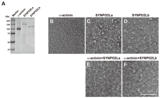 The fact that SYNPO2L colocalizes with both α-actinin and actin filaments in mouse cardiomyocytes indicates that the three proteins might interact with one another and be involved in actin remodeling to maintain the structure of the sarcomere. To test this possibility comprehensively, we prepared recombinant SYNPO2La and SYNPO2Lb, and examined their effect on α-actinin and actin filaments. SYPRO Orange staining revealed that α-actinin, recombinant SYNPO2La, and recombinant SYNPO2Lb were highly purified (Figure 2A). TEM of negatively stained samples showed that α-actinin in the absence of other proteins was cylindrically shaped and 35.6 ± 0.83 nm in length (Figure 2B); this finding is consistent with previous reports showing that α-actinin dimers have an elongated straight shape [,]. On the other hand, SYNPO2La alone and SYNPO2Lb alone did not have cylindrical or linear structures; instead, these proteins had a globule form, and the SYNPO2La and SYNPO2Lb globules were of various sizes (Figure 2C,D). When α-actinin was mixed with SYNPO2La or SYNPO2Lb, the protein complexes were cylindrically shaped, and the majority of the structures were visibly different from the structure of α-actinin alone (Figure 2E,F). These results strongly suggest that SYNPO2La and SYNPO2Lb directly interact with α-actinin to form complexes.