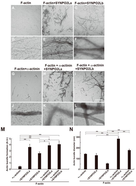 Next, we investigated the interaction of SYNPO2La or SYNPO2Lb with the actin filaments. The actin filaments alone were uniformly dispersed and did not form bundles (Figure 3A,D). As reported previously, α-actinin facilitated the formation of actin bundles [] (Figure 3G,J). The presence of SYNPO2La or SYNPO2Lb also caused the formation of actin bundles that had diameters of 131.8 ± 15.9 nm or 54.8 ± 4.0 nm, respectively (Figure 3B,C,E,F,M,N), suggesting that both SYNPO2La and SYNPO2Lb could directly bundle the actin filaments. Furthermore, the actin bundles that formed when α-actinin and actin/SYNPO2La were combined had larger diameters than those formed when α-actinin and actin were combined (Figure 3H,K,M,N). The diameter of actin bundles formed when α-actinin and actin/SYNPO2Lb were combined were of a similar size to those formed in the presence of α-actinin and actin (Figure 3I,L,M,N).