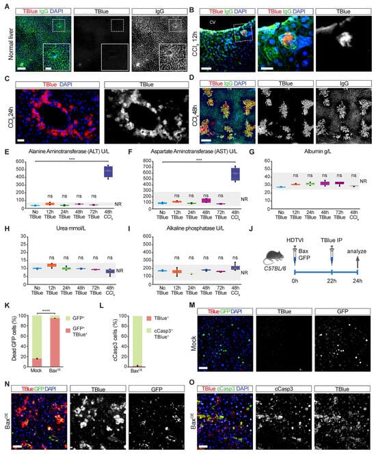 TBlue labels necrotic and apoptotic cells in vivo. (A) The liver section of a normal liver was injected with TBlue and stained for anti-mouse-IgG (green) showing normal sinusoids. Scale bars, 250 μm. Insert showing a magnified view of the normal liver tissue and the absence of cell death. Scale bars, 100 μm. (B–D) Liver sections of injured livers at 12, 24, and 48 hours after CCl4 administration from mice injected with TBlue (red) to mark dead hepatocytes. Staining with anti-mouse IgG (green) showing normal sinusoids and areas of injury. Scale bars, 100 and 40 μm for (B), 100 μm for (C), and 250 μm for (D). (E–I) Serum enzyme analysis showing the levels of ALT, AST, Alb, Urea, and ALP. NR, normal range (J) Experimental outline: C57BL/6 mice were hydrodynamically injected with the BAX and H2B-GFP plasmids. After 24 hours, all mice were euthanized and their livers processed for further staining. (K,L) Quantification of dead H2B-GFP possitive cells marked with TBlue and TBlue-labelled hepatocytes positive for cleaved caspase-3 after in vivo transfection of BAX by hydrodynamic tail vein injection. (M–O) Immunofluorescent staining of liver sections containing dead hepatocytes marked with TBlue and co-stained with cleaved caspase-3 after in vivo transfection of BAX by hydrodynamic tail vein injection. TBlue (dead hepatocytes, red), H2B-GFP (transfected hepatocytes, green), and DAPI (nuclei, blue) (scale bars, 100 μm). Data are means ± SEM. *** p < 0.001, **** p < 0.0001; n.s., not significant.