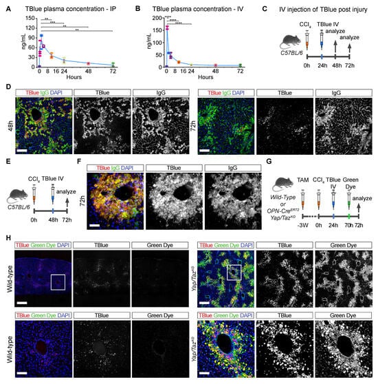 TBlue is suitable for pulse and chase experiments in vivo. (A,B) Time course showing the concentration of circulating TBlue in plasma from mice after intraperitoneal and intravenous administration. Plasma was collected at 0.5 (purple), 1 (pink), 2 (blue), 4(crimson), 12 (orange), 24 (light green), 48 (light pink) and 72 (green) hours after TBlue administration. (C) Experimental outline: C57BL/6 mice injected with TBlue at 24 hours post-CCl4. All mice were euthanized, and their livers were processed for further staining at the indicated times. (D) Immunofluorescent staining of liver sections showing dead hepatocytes marked with TBlue (red), IgG (green), and DAPI (blue). Scale bars, 100 μm. (E,F) Experimental outline and immunofluorescent staining of liver sections from, C57BL/6 mice injected with TBlue at 48 hours post CCl4. TBlue (red), IgG (green), and DAPI (blue). Scale bars, 100 μm. (G,H) Experimental outline and immunofluorescent staining of liver sections from wild-type and OPN-CreERT2; Yapfl/fl;Tazfl/fl mice injected with tamoxifen to induce the recombination of floxed alleles and then injected with CCl4 to cause injury. TBlue and Green Dye were injected at different time points post CCl4 to mark different populations of dead hepatocytes. TBlue (red), IgG (green), and DAPI (blue). Scale bars, 100 μm. Data are means ± SEM. ** p < 0.01, *** p < 0.001, **** p < 0.0001.