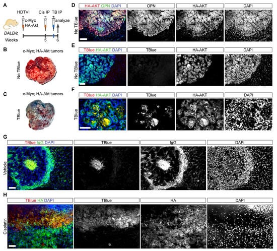 Detection of liver cancer cell death upon Cisplatin treatment. (A) Experimental outline: BALB/c mice injected with TBlue at 6 weeks of tumor development induced by HDTVI of Sleeping Beauty plasmids encoding for the oncogenic c-MYC and AKT proteins. All mice were euthanized and their livers were processed for further staining at the indicated times. (B,C) Whole mount livers with cholangiocarcinoma from mice injected with saline or TBlue. (D) Immunofluorescent staining of liver sections showing the expression of the cholangiocarcinoma marker Osteopontin (OPN, green), HA-AKT (red), and DAPI (blue). Scale bar, 250 μm. (E,F) Immunofluorescent staining showing TBlue-positive dead cholangiocarcinoma cells as marked by HA-AKT (green), TBlue (red), and DAPI (blue). (E) Contains TBlue (red) and IgG (green) showing dead cells in the core of cholangiocarcinoma tumors. Scale bar, 250 μm. (F) Immunofluorescent staining of liver sections showing massive cell death in cholangiocarcinoma tumors from mice treated with one dose of Cisplatin. HA-AKT (green), TBlue (red) and DAPI (blue). Scale bar, 250 μm (G,H).