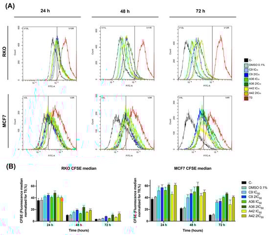 RKO and MCF7 cell proliferation was evaluated through flow cytometry using the Carboxyfluorescein Diacetate Succinimidyl Ester (CFSE) probe. Confluent cells were collected, rinsed with PBS 1×, and incubated with 5 μM of CFSE for 15 min at 37 °C. Then, the cells were rinsed, resuspended in growth medium, and seeded in 12-well plates at 1 × 105 cells/mL. After 24 h, adherent cells were treated with compounds C9, A36, and A42 at IC50 and 2 × IC50 concentrations or 0.1% DMSO (vehicle). Untreated cells were used as controls. The cells were harvested at different time points of 0 h, 24 h, 28 h, and 72 h. The cells were then analyzed in a flow cytometer and the CFSE median fluorescence intensity was quantified using the FITC-A channel. All median values were normalized to the time point 0 h.