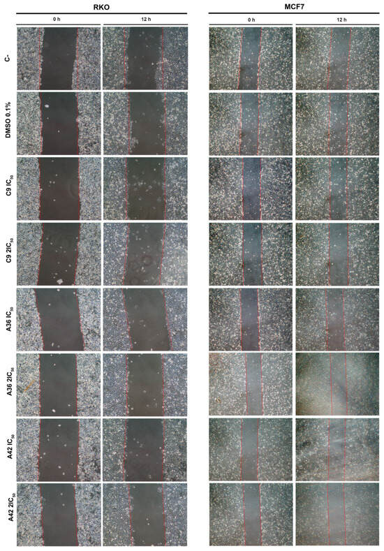 RKO and MCF7 cells were seeded in 12-well plates at densities of 5 × 105 cells/mL and 4.5 × 105 cells/mL, respectively. After 24 h, a wound was created by scraping the cell layer using a 1 mm pipette tip. The cells were treated with C9, A36, and A42 at IC50 and 2 × IC50 concentrations or 0.1% DMSO (vehicle). Untreated cells were used as controls. The wound regions were photographed at 0 and 12 h, and migration was assessed using the Image J software. The relative migration was calculated in relation to the untreated controls.
