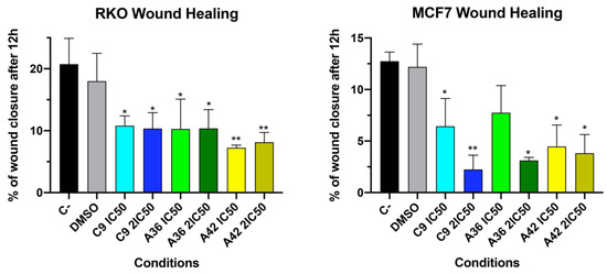 Effects of C9, A36, and A42 on cell migration of RKO and MCF7 cell lines. Representative images (10× magnification) of wound healing assay after exposure of RKO and MCF7 cells to C9, A36, and A42 at IC50 and 2 × IC50 for 0 h and 12 h. Untreated cells (C– and DMSO (0.1%)-exposed cells were used as negative controls. Quantification of the % of wound closure after 12 h. The values are means with SD (n ≥ 3). The statistical analysis was conducted using one-way ANOVA. * p < 0.05 and ** p < 0.01.