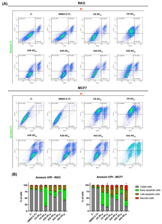One of the main goals of clinical oncology is the development of compounds and treatments capable of selectively eliminating cancer cells. In this sense, we next evaluated the capability of the compounds to induce cell death in both cell lines. For this, we performed a flow cytometry analysis using annexin V-FITC and propidium iodide PI double staining. The conjugation of these two probes allowed for the discrimination of viable (negative for both), early apoptotic (annexin + and PI−), late apoptotic (annexin+ and PI+), and necrotic (annexin− and PI+) cells. RKO and MCF7 cells were exposed to 2 × IC50 and 4 × IC50 of the compounds for 48 h. Both flouting and attached cells were harvested and double stained. The results are summarized in Figure 6. The analysis showed that, globally, all the compounds induced cell death in the RKO and MCF7 cells and mainly increased the number of apoptotic cells (early and late) (Figure 6B). C9 and A42 were revealed to be the most powerful compounds, and the MCF7 cell line was the most sensitive cell line.