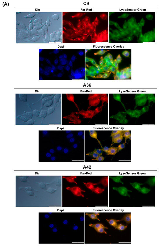 For fluorescence staining observations, RKO and MCF7 cells were co-stained with the compounds and with LysoSensor Green DND-189 and DAPI. The RKO and MCF7 cells were plated on microscopy slides with a density of 1.5 × 105 cells/mL and allowed to adhere for 24 h. On the next day, the cells were exposed to C9, A36, and A42 IC50 for 3 h. The cells were washed and resuspended in PBS 1× and then stained for 30 min at 37 °C with 2 μM of LysoSensor Green. The cells stained with LysoSensor Green were co-stained with DAPI at a final concentration of 10 μg/mL. The Olympus BX6F2 microscope (40× and 60× oil immersion objectives) (Tokyo, Japan) was utilized to analyze the samples. It was fitted with the appropriate filter cubes, which included U-FDICT (differential interference contrast), TLV-U-FF-FITC (green), U-FYW (far-red), and U-FUNA (blue).