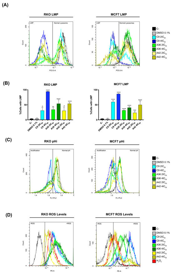 Since ROS generation is reported to precede LMP and cell death [70], and in view of reports showing that some compounds of this family increase intracellular ROS levels under certain circumstances [71,72], we also investigated whether C9, A36, and A42 had any effects in this regard. Indeed, by flow cytometry using dihydroethidium (DHE), a probe that allows for the direct detection of superoxide and hydrogen peroxide, we observed that all compounds, including C9 with a higher intensity, led to a very significant increase in the ROS levels in the two cell lines, as shown by an increase in the fluorescence mean of DHE (Figure 8D). In fact, these high levels of ROS seem to suggest that there may be a link with LMP, as they may be related to lysosomal membrane damage and consequent lysosomal permeabilization, as occurs in several cases of LMP-associated cell death [73,74,75].