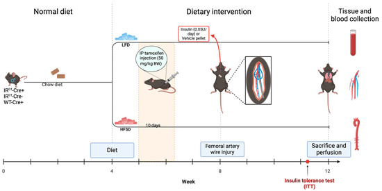 Experimental timeline: Male mice (controls (IRf/f-Cre (−), IRw/w-Cre (+)), and IRf/f-Cre (+)) were fed with either a low-fat diet (LFD) or high fat, high sucrose diet (HFSD) at 4 weeks of age followed by 10 consecutive daily i.p. injections of tamoxifen to induce Cre recombination in the IRf/f-Cre(+) mice. Prior to femoral artery wire injury at Week 8, mice were implanted with either an insulin (0.05 U/day) or vehicle pellet. Insulin tolerance tests (ITTs) were conducted five days prior to sacrifice. Body weight and fasted and fed blood glucose measurements were obtained weekly until sacrifice at Week 12, wherein tissue and blood were collected for histological analysis and metabolic parameters, respectively.