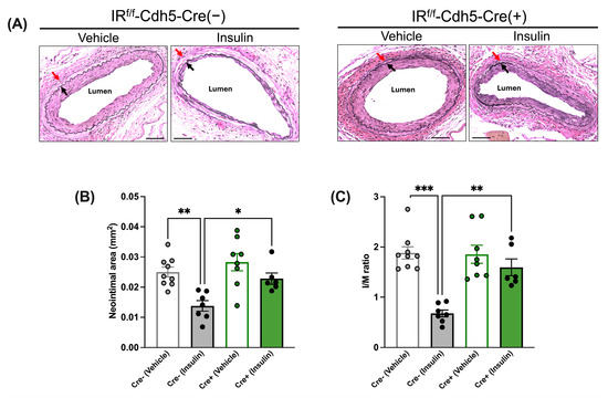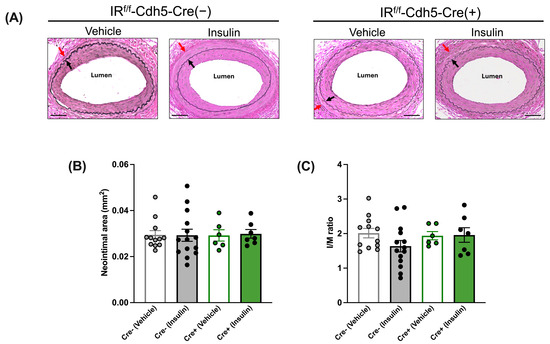 The morphological analysis of injured femoral arteries indicated that in the absence of insulin treatment (i.e., after vehicle treatment), the neointimal area and I/M ratio were comparable between tamoxifen-treated IRf/f-Cdh5-Cre(−) control mice and IRf/f-Cdh5-Cre(+)EC-specific IR-deficient mice (Figure 3A–C). Further, in IRf/f-Cdh5-Cre(−) control mice, insulin treatment led to a decrease in the neointimal area (Figure 3B) and I/M ratio (Figure 3C). Conversely, in IRf/f-Cdh5-Cre(+)EC-specific IR-deficient mice, the neointimal area and I/M ratio were not significantly affected by insulin treatment (Figure 3A–C).