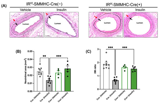 Insulin has been shown to directly exert multiple actions in the cardiovascular system in addition to its metabolic actions [6,7]. Notably, it is still debated whether insulin is protective or detrimental in the vasculature [6,7]. Early in vitro studies demonstrated that supraphysiological concentrations of insulin promoted vascular smooth muscle cell (SMC) migration and proliferation mediated via the mitogen-activated protein kinase (MAPK) pathway, suggesting insulin’s adverse effects [8]. However, in vivo studies have shown that the effects of insulin are mostly beneficial (i.e., vasodilatory, anti-inflammatory, anti-atherogenic) [9,10] and mediated via the phosphatidylinositol 3-kinase (PI3K)/protein kinase B (Akt)/endothelial nitric oxide synthase (eNOS) pathway [11]. Indeed, our previous studies in rodent models of restenosis showed that administration of insulin was effective in reducing neointimal hyperplasia, the main factor for in-stent restenosis [12,13]. Further, we have recently found that in insulin-sensitive, chow-fed mice, deletion of either the endothelial or the SMC insulin receptor (IR) abolishes the effect of insulin to decrease neointimal growth [14].