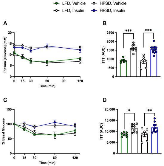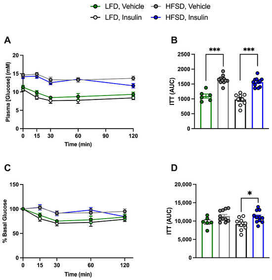 High-fat, high-sucrose-diet-induced insulin resistance in tamoxifen-treated smooth-muscle-cell-specific (SMC) insulin receptor (IR)-deficient and control (IRf/f-Cre (−)) mice (combined), irrespective of prior insulin treatment. Following 4 h of fasting, an insulin tolerance test (ITT) was conducted on mice, which received an intraperitoneal injection of insulin at 0.5 U/kg. Plasma glucose levels were measured at 0, 15, 30, 60, and 120 min. (A): Plasma glucose levels and (B): ITT area under the curve (AUC) in (A). (C): Percentage (%) of basal glucose and (D): ITT area under the curve in (C). LFD: Low-fat diet; HFSD: high-fat, high-sucrose diet. Data are expressed as mean ± SEM. Parametric or non-parametric tests were applied according to the results of normality tests. (B,D): One-way ANOVA followed by Tukey’s test: * p < 0.05; *** p < 0.001. n > 6 for each group.