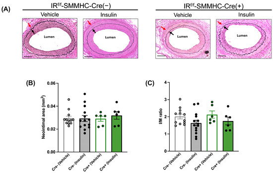 To rule out that Cre expression itself interferes with the effect of insulin on neointimal growth, we studied tamoxifen-treated Cre-positive wild-type mice (IRw/w-Cdh5-Cre(+) and IRw/w-SMMHC-Cre (+)), which are other control groups. We found that insulin treatment led to a decrease in the neointimal area (Supplementary Figure S2B) and I/M ratio (Supplementary Figure S2C) in IRw/w-Cdh5-Cre(+) control mice compared to vehicle treatment (Supplementary Figure S2A–C). Similarly, insulin treatment led to a decrease in neointimal area and I/M ratio in IRw/w-SMMHC-Cre(+) control mice, compared to vehicle treatment (Supplementary Figure S3A–C).