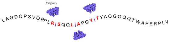 Calpain cleavage sites in the H1 region. Calpain cleavage sites are predicted using the online predictor tool (DeepCalpain) in the Hinge 1 region containing 38 amino acids.