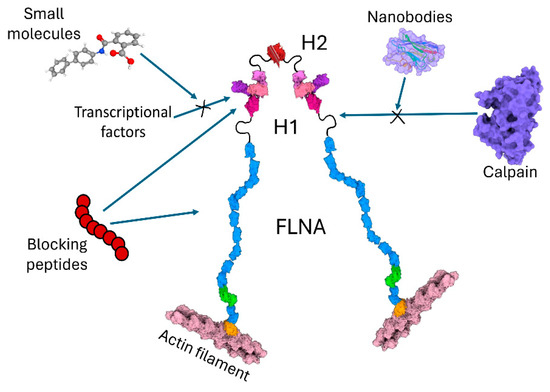 Protein mimotopes, or blocking peptides, are small therapeutic peptides that may be designed to prevent FLNACT from interacting with its critical partners by selectively targeting specific binding sites (Figure 3 and Figure 4). Challenges in blocking specific peptide designs, production in sufficient quantities, high binding affinity, possible off-target effects, half-life, and mode of administration remain for the potential use of these therapeutic peptides [43]. To identify novel strategies in blocking specific binding sites of FLNA partners, high-throughput screens of small molecules are also promising. Such a small molecule, kartogenin, binds to FLNA, disrupting its interaction with the transcription factor core-binding factor β subunit (CBFβ), and induces chondrogenesis by regulating the CBFβ-RUNX1 transcriptional program in osteoarthritis [44]. Another rapidly growing exciting front is the development of nanobodies in a wide variety of research fields, particularly in the diagnosis and treatment of diseases [45]. To increase affinity, stability and expression levels, libraries of small single domain antibodies containing antigen binding variable domains of the heavy chain are being screened in exciting disease models as they easily penetrate tissues, are humanized for pharmaceutical applications, and are converted into different formats such as Fc-fusion proteins and heterodimers as modular building blocks targeting intracellular proteins. Prediction and analysis results provide helpful information to reveal the regulatory mechanism of calpain cleavage in different cancer types. The design and development of such nanobodies which bind to the H1 domain of FLNA to occupy motifs that are used for proteolysis by calpain (Figure 3), specific sites of FLNACT interacting with transcriptional factors, or cellular signaling molecules that are critical for carcinogenesis are attractive approaches. Membrane penetration capabilities, the ability to recognize unique antigens, and tumor cell specificity are the future challenges of cancer therapeutics. To this end, such antibodies must be specifically delivered inside the living tumor cell. Nevertheless, targeting B-cell maturation antigens, nanobodies have recently been approved to treat human refractory/relapsed multiple myeloma [46]. For nanobody-mediated targeting strategy into the cells, viral vectors such as adenovirus-associated viral vectors have been utilized locally or systemically in preclinical models of human cancer [47].