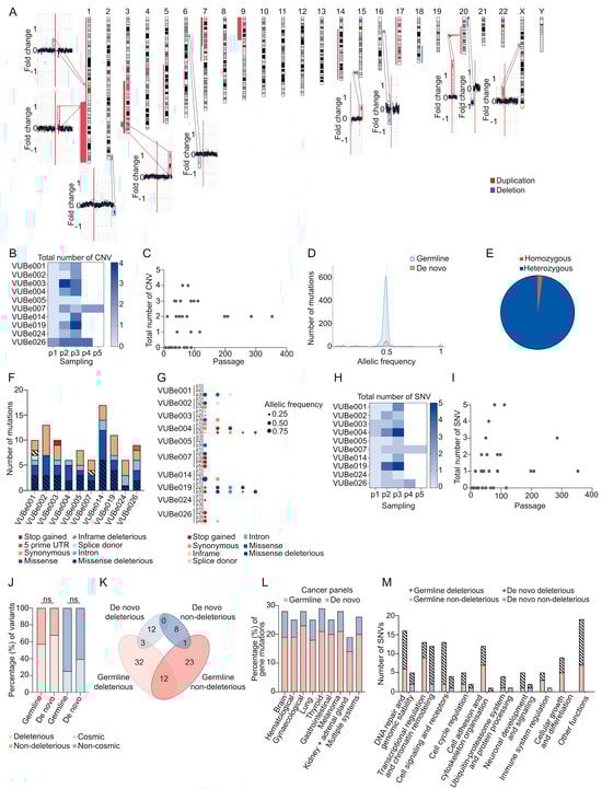 The CNVs and point mutations identified in the hESC samples from 10 different lines at multiple passages. (A) An ideogram showing the location of all gains (red) and losses (blue) found in the 10 hESC lines, as well as the shallow sequencing results of samples in which we found unique CNVs, such as gains on chromosomes 1, 3, 7, 9, 15, and X, and losses on chromosomes 2, 6, 16, and 20, that are not recurrent in hPSCs. (B) A heatmap of the total CNVs across different passages for each cell line. Each column (P1, P2, P3, P4, P5) represents the sequential sampling points (first, second, third, fourth, and fifth passages tested, respectively). (C) The total number of CNVs vs. the culture period in vitro across all the hESCs lines. Each dot represents a single cell line at a specific passage number. (D) Histogram representing the distribution of the allelic frequencies of all mutations grouped by mutation origin (germline, and de novo). (E) The distribution of the detected germline mutations by zygosity. The pie chart illustrates the proportion of homozygous (red) vs. heterozygous (blue) mutations identified in the samples. (F) The bars represent the distribution of mutation categories for germline SNPs and the number of events detected in each hESC line. (G) An overview of the de novo SNPs, the types of mutations detected in each passage of each hESC line, and the read frequency of each variant. Large bubble: high allelic frequency (0.75); average bubble: intermediate allelic frequency (0.50); small bubble: low allelic frequency (0.25); no bubble, no variant detected. (H) The heatmap shows the incidence and the number of de novo mutations found in hESC lines depending on their culture period in vitro. (I) The total number of SNVs vs. culture period in vitro across all the hESCs lines. Each dot represents a single cell line at a specific passage number. (J) The proportion of deleterious and non-deleterious variants (%) found among both the germline and de novo variants and whether they are reported in the COSMIC database. (K) A diagram showing the number of genes with germline (pink) or de novo (blue) mutations, and their pathogenic effect. (L) The distribution of gene mutations (%) across different cancer panels, categorized into germline (pink) and de novo mutations (blue). The y-axis represents the percentage of gene mutations, while the x-axis lists the various cancer types. (M) The bar graph illustrates the number of SNVs across various functional categories, differentiating between germline and de novo mutations, as well as their deleterious and non-deleterious effects.