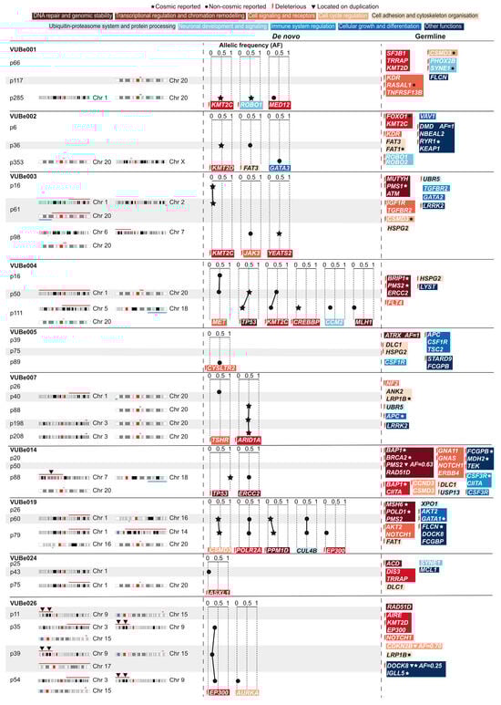 We categorized the mutations based on their potential deleterious effect, including stop gains and missense variants, and assessed their clinical relevance by checking if they had been previously reported in the Catalog of Somatic Mutations in Cancer (COSMIC: https://cancer.sanger.ac.uk/cosmic (accessed on 19 August 2024), irrespective of their tier. Remarkably, most of the identified germline and de novo variants were potentially deleterious, with no statistically significant differences between the two groups (57.3% (55/96) vs. 67.85% (19/28), respectively (two-tailed Fisher’s exact test, p = 0.3842, Figure 1J)). Likewise, 39.28% (11/28) of the de novo mutations had been reported in COSMIC, compared to 25% (24/96) of the germline mutations, which was also not statistically significant (two-tailed Fisher’s exact test, p = 0.1568, Figure 1J). We next investigated the similarities or differences between germline and de novo variants in terms of affected genes. Twelve genes carried both deleterious and non-deleterious germline SNVs, whereas in the de novo SNVs, the genes with deleterious mutations were unique and distinct from those with non-deleterious variants. Additionally, the germline and de novo SNVs had four genes in common (Figure 1K). Taken together, this shows that the germline and de novo SNVs differed in terms of potential functional impact. We then classified all the SNVs based on the cancer types with which the gene mutations are typically associated. The results show that there is not an especially enriched mutational profile associated with specific types of cancer in germline or de novo SNVs (Figure 1L). Lastly, we categorized the variants according to the gene’s function. Notably, de novo SNVs predominantly affected genes involved in transcriptional regulation and chromatin remodeling and were statistically significantly more often deleterious than their germline counterparts (p = 0.0154, Fisher’s exact test, Figure 1M).