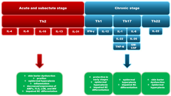Initiation of AD is preceded by an acute phase characterized by increased activation of Th2, Th22, and Th17 lymphocytes. The progression to the chronic phase is characterized by the concurrent activation of Th1 cells along with the persistent activation of Th2 and Th22 cells. There is mounting evidence indicating a significant upregulation of IL-22 in the skin of individuals with AD [30,114,115]. IL-22 has been associated with epidermal hyperplasia and has been implicated in inhibiting the terminal differentiation of keratinocytes. Additionally, it induces processes such as the expression of S100A120 and S100A136, leading to hyperplasia [115,116,117]. The expression of IL-22 is also associated with markers such as keratin 6 and keratin 16, which serve as indicators of epidermal growth and proliferation [23].
