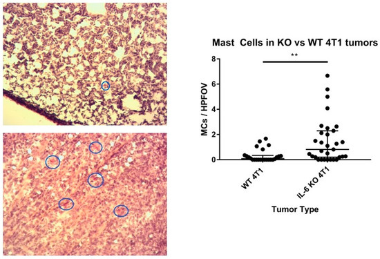 Between 8–12 images were taken per section, from individual tumors in 60 female BALB/c mice (n = 30 per group, WT and IL-6KO), ensuring that the center and edges for each section were imaged. MCs were quantified, and data were analyzed based on each sample’s average number of MCs per high-powered field of view [13].