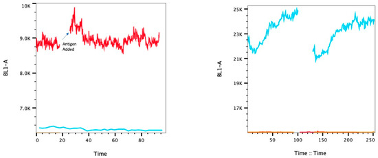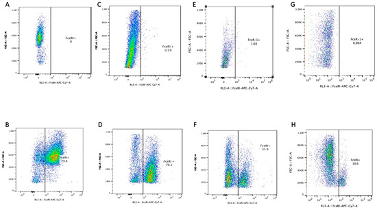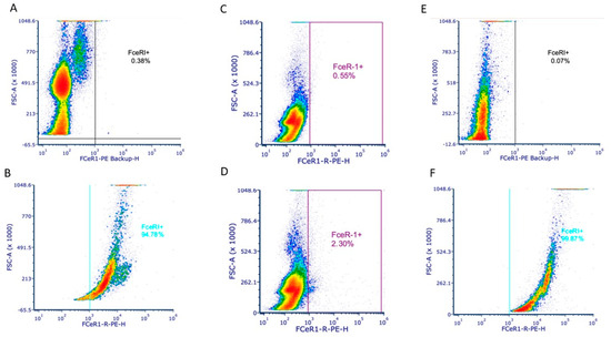 Samples were prepared using the following protocol adapted from the BioLegend Cell Surface Flow Cytometry Staining Protocol [14]. Cells suspended in complete medium (~1 × 106 cells/mL) were added to 2 mL Eppendorf tubes and centrifuged at 350× g for 5 min. Media were discarded. Cells were washed twice with cell staining buffer (BioLegend). Supernatant was discarded. Fc block was added to the pellets and left at 4 °C for 10 min. The antibody (diluted per manufacturer recommendation) and enough cell staining buffer were added to bring the total volume to 100 µL. The samples were incubated again at 4 °C for 20 min. The volume of the tubes was raised using cell staining buffer (~600 µL). Samples were centrifuged at 350× g for 5 min. The supernatant was discarded, and samples were washed twice in a similar fashion using cell staining buffer. The supernatant was discarded, and the samples were resuspended in 1 mL of cell staining buffer. Approximately one million cells were analyzed per sample, no-stain controls were compared to isotype to confirm lack of non-specific binding, and cells were otherwise stained using the FcεRIα antibodies.