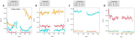 Human Cell Ca2+ Assay. (A) LAD2 Ca2+. (B) E3 Ca2+. (C) EWD8 Ca2+. (D) MCF7 Ca2+. LAD2 showed increased Ca2+ after the addition of antigen, as expected. E3, EWD8, and MCF7 showed no change in Ca2+ post-antigen stimulation.