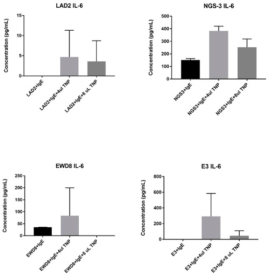 IL-6 ELISA results. LAD2 and NGS3 produced IL-6 as expected when given IgE and antigen. E3 and EWD8 also produced IL-6 which was an unexpected result. 4T1 and MCF7 did not produce any IL-6, and thus are not depicted here.