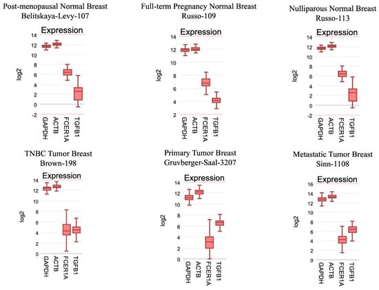 Of the six genomic data sets examined, three being normal breast tissue at different life/reproductive stages and three being tumor tissue, there was an overall trend between normal and cancerous: FcεRI was downregulated in a tumor compared to normal tissue. TGF-β is up-regulated in a tumor, consistent with the tumor immunological skewing effect we see in cancer [24]. These differences are seen regardless of studies compared, though it should be noted that these are rough comparisons and should not be treated as matched groups since they are independent, different study sources. Rather these data are illustrative of the following points: FcεR1 being downregulated is an interesting result because it is the opposite of what we see in immortalized cell lines that are commonly used to study BC (Figure 10). This result shows a difference between primary tissue removed from a human patient and the assays conducted with immortalized human cell lines.