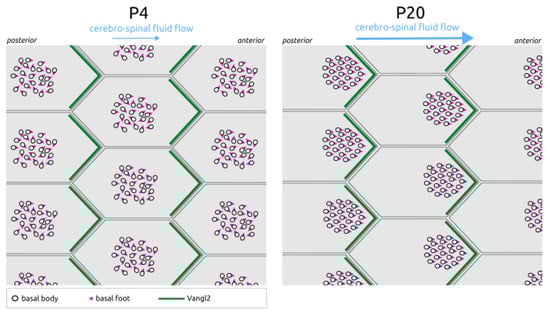 It was first shown that in Xenopus embryonic epidermis multi-ciliated cells, an initial bias in ciliary beating polarity, which initially depends on a planar polarization of basal body appendages, is in a second phase refined by fluid flow. Fluid flow can even reorient cilia polarization, but only when cilia are motile, suggesting a positive feedback mechanism, where flow aligns ciliary beating, which then reinforces the flow [80]. A subsequent study on mouse ependymal multi-ciliated cells [34] showed that fluid flow can establish coordinated ciliary beating polarity in wild-type mice but not in Vangl2 mutants or in Kif3a mutants lacking cilia, suggesting a model in which fluid flow initiates a positive feedback loop that also requires Vangl2. In this system, the mechano-sensitive channels Pkd1 and Pkd2 might transduce this mechanical signal since they are only expressed along the axonemes of multi-ciliated cells and their mutation triggers a loss of ciliary beating polarization [63].