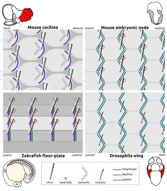 Most epithelia display planar cell polarity (PCP), characterized by the coordinated positions and orientations of external structures on their apical cell surface, whether they are microtubule-based cilia or actin-based trichomes and stereocilia. PCP allows motile cilia to generate a directional flow of extracellular fluid, which is crucial, for instance, for proper cerebrospinal fluid (CSF) circulation or for the establishment of left–right asymmetry in vertebrate embryos [1]. PCP is also instrumental in organizing and orienting mechano-sensing structures such as kinocilia in zebrafish neuromasts or stereocilia bundles in the organ of Corti of the mammalian inner ear. Cilia within monociliated epithelia are built from the oldest centriole of the pair, the mother centriole [2] (Figure 1), while the vast majority of motile cilia from multi-ciliated cells are templated by daughter centrioles [3]. Besides this difference, the asymmetric positioning of cilia implies an asymmetric positioning of centrioles. To grow a cilium, a centriole will have to be modified and acquire distal appendages (DAs), which are protein complexes mediating centrioles anchoring either to the plasma membrane or to the ciliary vesicle (Figure 1) (reviewed in [4]). The modified centriole, called the basal body, is also decorated by sub-distal appendages. In motile cilia, one such appendage of triangular shape is called a basal foot and points in the direction of the ciliary stroke in multi-ciliated cells [5,6], as well as in monociliated cells [7]. Other sub-distal appendages called rootlets also decorate the basal body, but their exact number and orientation depend on the cell type and the maturation of the epithelium (reviewed in [8]) (Figure 1). The basal body nucleates ciliary microtubules that constitute the axoneme, protruding into the extracellular space.