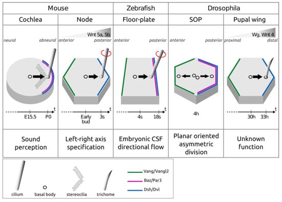 Timing of basal body and centriole planar polarization in different systems. The planar polarization of basal bodies and centrioles happens within different time scales ranging from a few hours (Drosophila Sensory Organ Precursor (SOP), mouse node and pupal wing) to days (mouse cochlea). This polarization depends on the planar polarization of polarity proteins such as Par3, Vangl2 and Dvl. Upstream polarizing cues such as Wnt gradients have been described in the mouse node and the Drosophila pupal wing. Centriole position shifts are indicated by black arrows. The bottom line of the table indicates the various functions that depend on the planar polarization of these tissues. E15.5: mouse embryonic day 15.5. P0: mouse post-natal day 0. Early bud: the “bud” stage of a mouse embryo corresponding to E7.5. s: somite; h: hour.