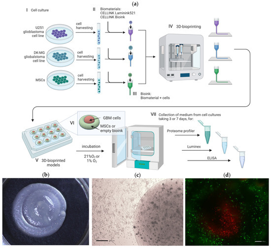 We used CELLINK Laminink521 and CELLINK Bioink biomaterials provided by Cellink (Bico Group; Gothenburg, Sweden) to create 3D-bioprinting models (a schematic overview of the 3D-bioprinting experiments is shown in Figure 1a). First, U-251, DK-MG, or human mesenchymal stromal cells (MSCs) were resuspended separately in PBS (Figure 1a(I)), added to CELLINK Laminink521 and CELLINK Bioink (Figure 1a(II)), and mixed according to the manufacturer’s instructions (‘Mixing Cells Protocol’ CELLINK Series) (Figure 1a(III)). Cells were prepared at a final density of 1.2 × 106/mL of bioink. The bioinks containing cells were transferred into an empty 3 mL sterile cartridge (Cellink, Bico Group, Gothenburg, Sweden), and used for 3D bioprinting (Figure 1a(IV)).