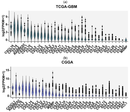 Expression profile of 35 chemokines ranked from most highly to least-expressed genes in glioblastoma multiforme tumor tissues obtained from analysis of RNA sequencing data from (a) TCGA-GTEx cohorts and (b) CGGA cohort. The gene expression profiles of FPKM (fragments per kilobase of transcript per million fragments mapped) type of glioblastoma multiforme samples of 166 patients were downloaded from TCGA Xena Hub cohort filtered for glioblastoma, accession date 9 February 2022 [22,23] and from 663 patients from Chinese Glioma Genome Atlas (http://www.cgga.org.cn/), accession date 9 February 2022 [24]. The graph shows normalized chemokine gene expression as log2-transformed FPKM + 1 values.