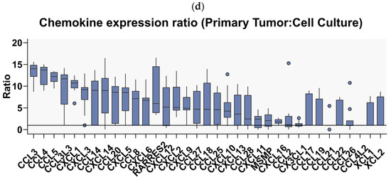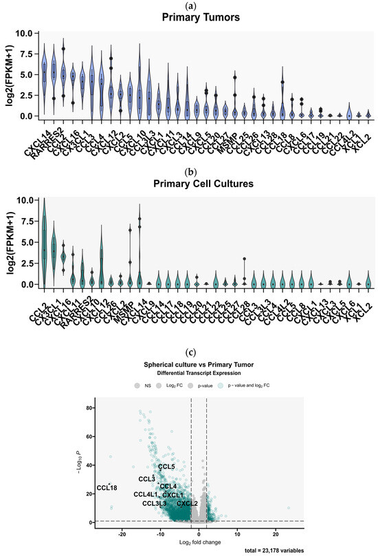 Having determined the profile of expressed chemokines in GBM tissues, we then proceeded to investigate whether this profile is preserved in ex vivo cell cultures derived from the tumors. We used previously collected sequencing data comparing the chemokine expression profiles between 12 GBM tumor tissues and 12 ex vivo spheroid cultures derived from these tumors, which were maintained in serum-free neurobasal medium [25]. The results clearly demonstrated that the expression of many chemokines was significantly downregulated in GBM spheroid cultures (Figure 3a). In particular, the expression of CCL3, CCL4 (and their ligands CCL4L1 and CCL3L3), CCL5, CXCL1, CXCL3, CCL14, CCL20, CXCL5, CCL8, CXCL6, CXCL12, and CXCL9 was significantly decreased (Figure 3a). None of the chemokines were upregulated in the GBM cells maintained in spheroid cultures. Moreover, the expression of only a few of the entire profile of chemokines expressed in GBM tumors was preserved in spherical cultures (mainly CCL2, CX3CL1, CXCL16, CXCL11, CXCL10, CXCL12, CXCL26, CXCL2, and CXCL14, Figure 3b). Within the most highly expressed chemokines in tumor tissues, we observed the largest decrease in the number of transcripts (indicated by the tumor/cell culture ratio) for CCL3 (and CCL3L3), CCL4 (and CCL4L1), CCL5, CXCL1, CXCL3, CXCL14, and CXCL12, whereas the smallest changes were observed for CX3CL1, CCL2, CXCL16, and CXCL11 (Figure 3c).