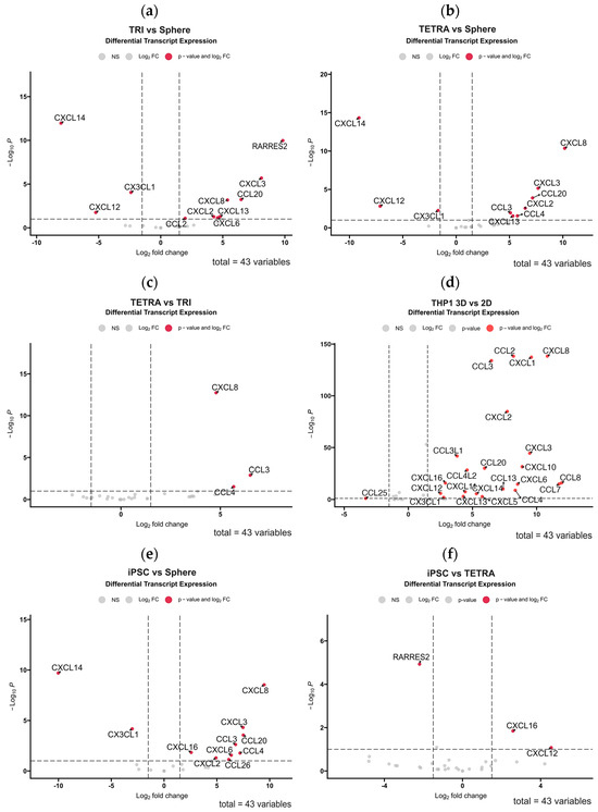 Volcano plot diagrams showing the results of differential chemokine gene expression analysis among different in vitro culture systems performed using RNA sequencing data previously published in Tang et al. (2020) [3]. The diagrams illustrate how the use of different 2D culture systems and 3D-bioprinted cultures of primary glioblastoma multiforme stem cells (GSCs) without/with astrocytes, neural progenitor cells (hNP1) and macrophages from THP1 lineage or differentiated from human-induced pluripotent stem cells (iPSCs), affects chemokine gene expression. Sphere culture: cell culture of GSCs in the form of non-adherent spheroids; TRI (triculture system): 3D-bioprinted culture of GSCs with surrounding astrocytes and hNP1; TETRA (tetraculture system): 3D-bioprinted culture of GSCs and macrophages from THP-1 lineage along with surrounding astrocytes and hNP1; iPSC system: 3D-bioprinted culture of GSCs along with macrophages differentiated from hiPSCs with surrounding astrocytes and hNPRed points in the graphs represent chemokine genes with a statistically significant difference in expression between the tested groups (downregulated if their Log2 fold change is below 0 or upregulated if it is above 0). The axes indicate the statistical significance (−Log10 p-value) versus fold change in expression (Log2 fold change) of significantly enriched chemokine genes in the comparative analysis of (a) TRI system to spherical culture, (b) TETRA system to spherical culture, (c) TETRA system to TRI system, (d) THP1 cell line culture in 3D bioprinting versus 2D culture, (e) iPSC system to spherical culture, and (f) iPSC system to TETRA system. Gene expression of 43 chemokines was analyzed in each comparison.
