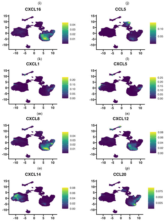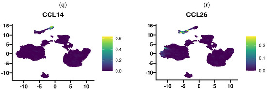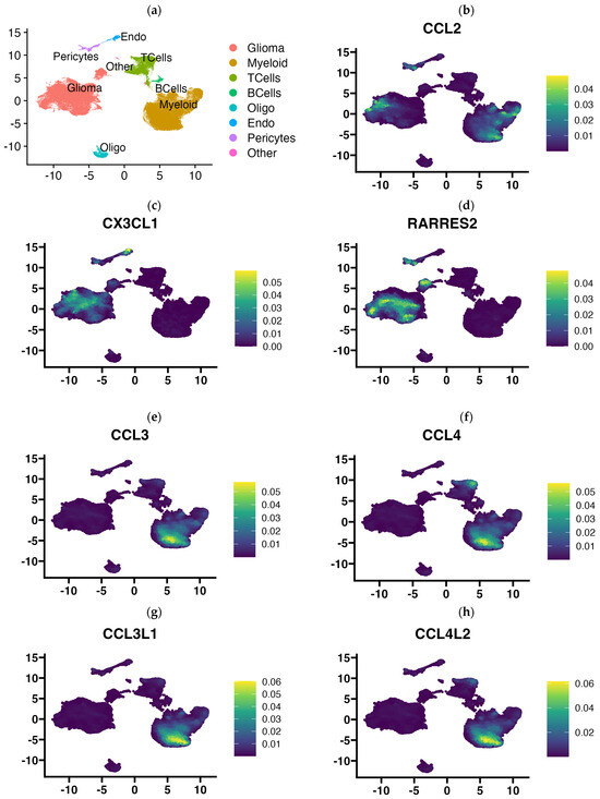 UMAP plots showing chemokine gene expression level according to the cell type present in glioblastoma multiforme tissues that were subjected to single-cell RNA-Seq analysis. Chemokine expression at a single-cell level from 2 low grade glioma and 16 primary glioblastoma multiforme tumors (201,986 cells) was projected onto the tSNE (t-distributed stochastic neighbor embedding) plots, annotated according to the cell signature clustering data from the original article by Abdelfattah et al. [34,35]. Diagram (a) indicates where certain cell types are located on the diagram: glioma cells, myeloid cells, T lymphocytes, B lymphocytes, oligodendrocytes, endocytes and pericytes, and others. Diagrams of the expression of (b) CCL2, (c) CX3CL1, (d) RARRES2, (e) CCL3, (f) CCL4, (g) CCL3L1, (h) CCL4L2, (i) CXCL16, (j) CCL5, (k) CXCL1, (l) CXCL5, (m) CXCL8, (n) CXCL12, (o) CXCL14, (p) CCL20, (q) CCL14, (r) CCL26, clustered according to cell type are presented above. Expression diagrams for the remaining chemokines are provided in Supplementary Figure S1. Single-cell RNA-Seq data were downloaded from Single Cell Portal (https://singlecell.broadinstitute.org/single_cell), accession date 13 March 2024 (SPC1985/GSE182109) [33] and imported into Seurat (v4.9.9.905). Visualization was performed using Nebulosa (v1.10.0) [36].