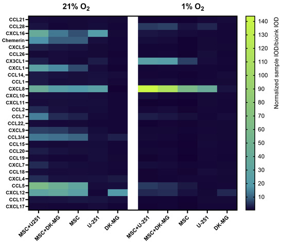 Heatmap showing relative chemokine secretion levels in medium collected from glioblastoma multiforme U251 and DK-MG cell lines 3D-bioprinted on CELLLINK Laminink521 with/without mesenchymal stromal cells (MSC) and cultured for 3 days in 21% O2 and 1% O2. Profiling was performed using the Proteome Profiler Human Chemokine Array Kit (R&D systems, Bio-Techne, Minneapolis, MN, USA). Samples pooled from 4 experimental replicates were used for profiling. The values on the graph represent the ratio of normalized optical density of dot blots from the sample to the optical density of dot blots from the culture medium incubated for 3 days with empty bioink.