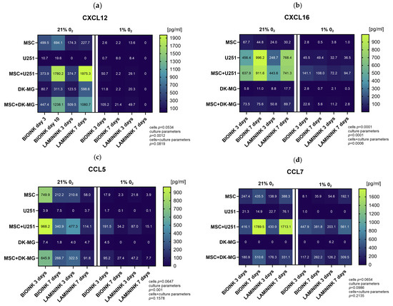 Finally, our study also indicates how much the choice of biomaterial used and the cell line affects the results of chemokine testing in 3D-bioprinting systems. It may be surprising how much the two GBM lines differ in their chemokine secretion levels. In our experimental setup, the U251 line secreted higher amounts than DK-MG of all chemokines tested except CXCLIt is very interesting that U251 cultured alone hardly secreted CXCL12, while DK-MG secreted its substantial amounts, but when co-cultured with MSCs, U251 with MSCs secreted higher amounts than DK-MG with MSCs. In addition, we noted a large effect of biomaterial type on the secretion of multiple chemokines in favor of CELLINK Bioink, but this effect was much more pronounced in case of MSCs than in GBM cells, and it appears that in the case of co-cultures, this was also an MSC-related effect.